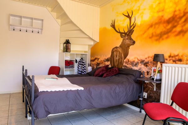 • Boven: een ruime kamer voor twee personen met eigen badkamer en eigen toilet. Dus met meer privacy. Vanuit deze kamer kijk je zo de rijbak in. Handig: als jouw paard in de rijbak staat, houd je ‘m vanaf je kamer in de gaten.