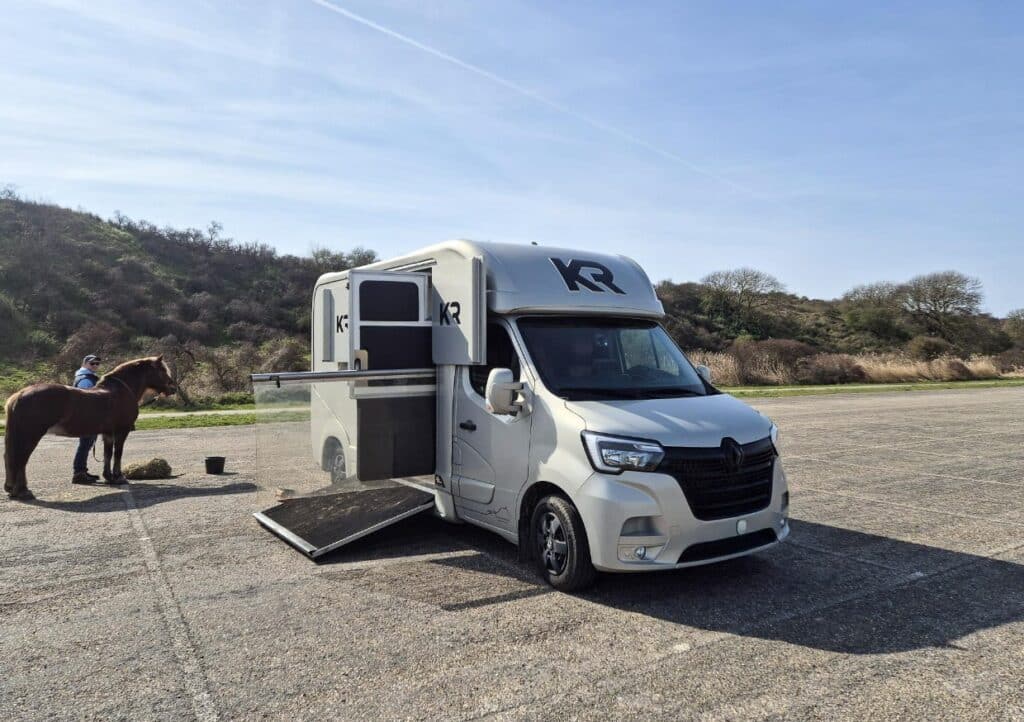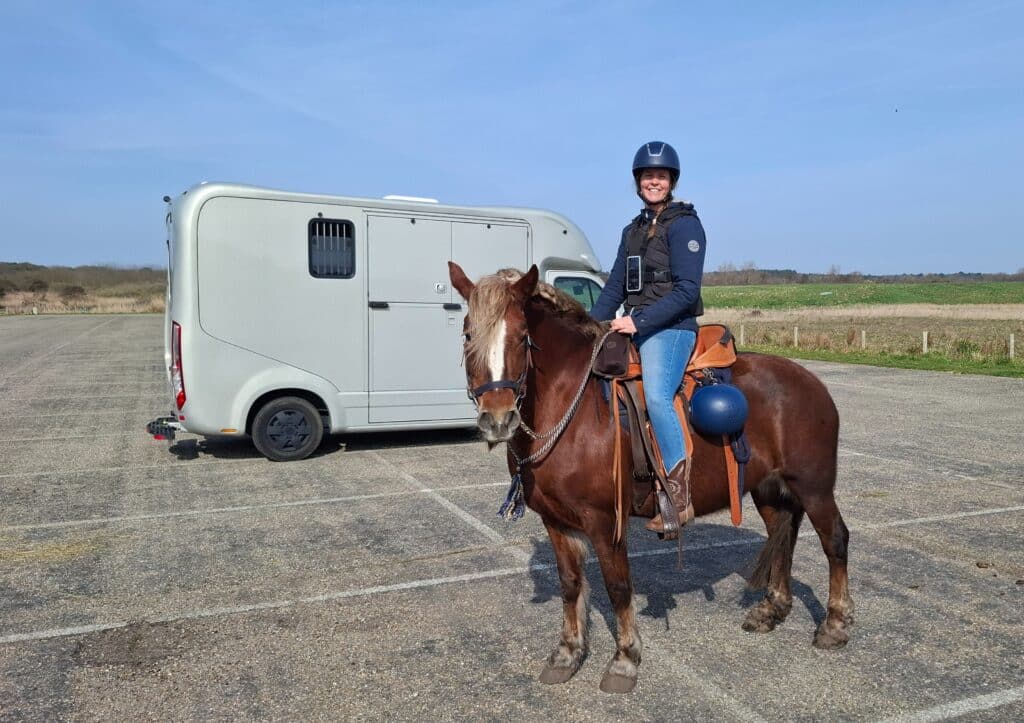Ik heb jullie eerder laten zien hoe ik heb geoefend met het trailerladen. Al dat trainen heeft zijn vruchten afgeworpen, want het laden ging perfect. Lot liep ontspannen op het vrachtwagentje dat ik gehuurd heb en we vertrekken rustig richting Westenschouwen, dé plek voor een mooie strandrit te paard.
