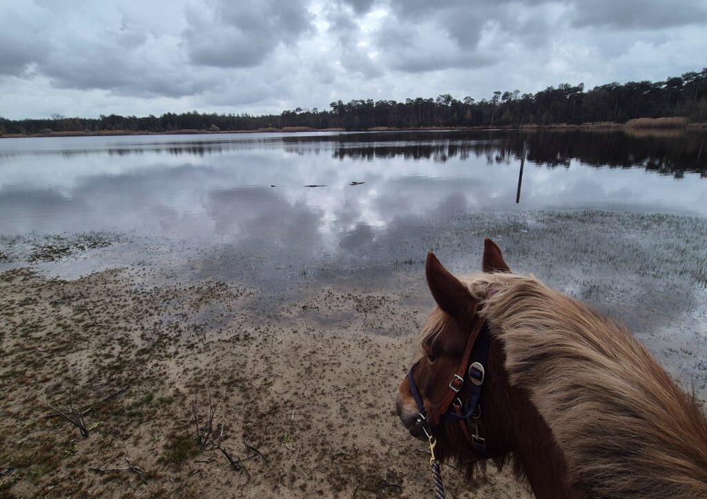 Onze rit begint heerlijk ontspannen. Een rustig stapje, een drafje… tot we bij het Ossengoor aankomen. Een prachtig meer en water trekt paarden nu eenmaal aan. Athans die van ons! Dus wij rijden met onze paarden het water in om even de voetjes te wassen. De paarden vinden het geweldig. Voor jullie hebben we natuurlijk leuke filmpjes gemaakt, zodat je een indruk krijgt van hoe mooi het is in de Chaamse bossen.